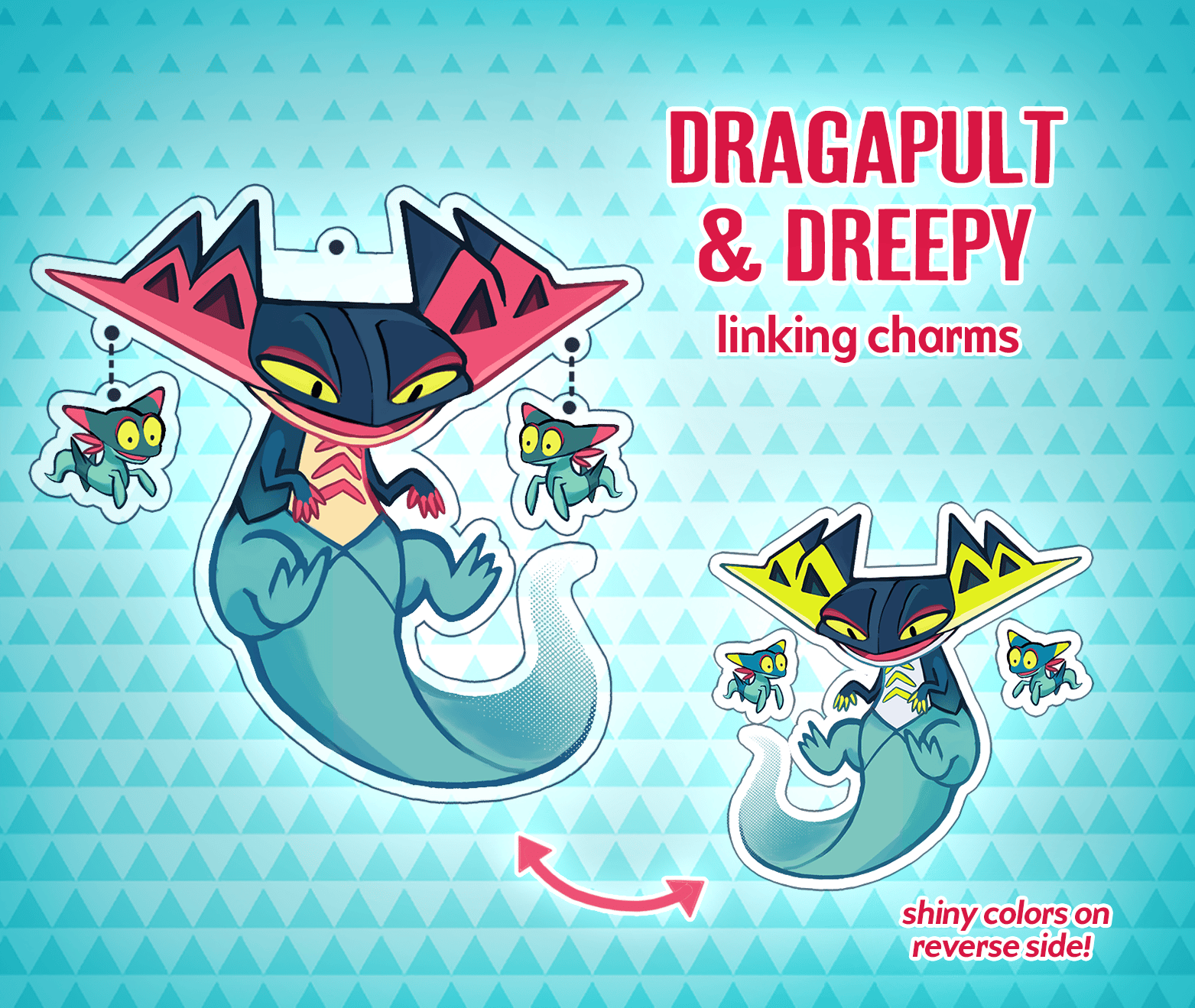⚠️ July preorders will be open until 07/30 (WEDNESDAY) at 7pm EST and will ship out before the end of August. ⚠️ 3 piece Dragapult linking charm printed on clear acrylic!