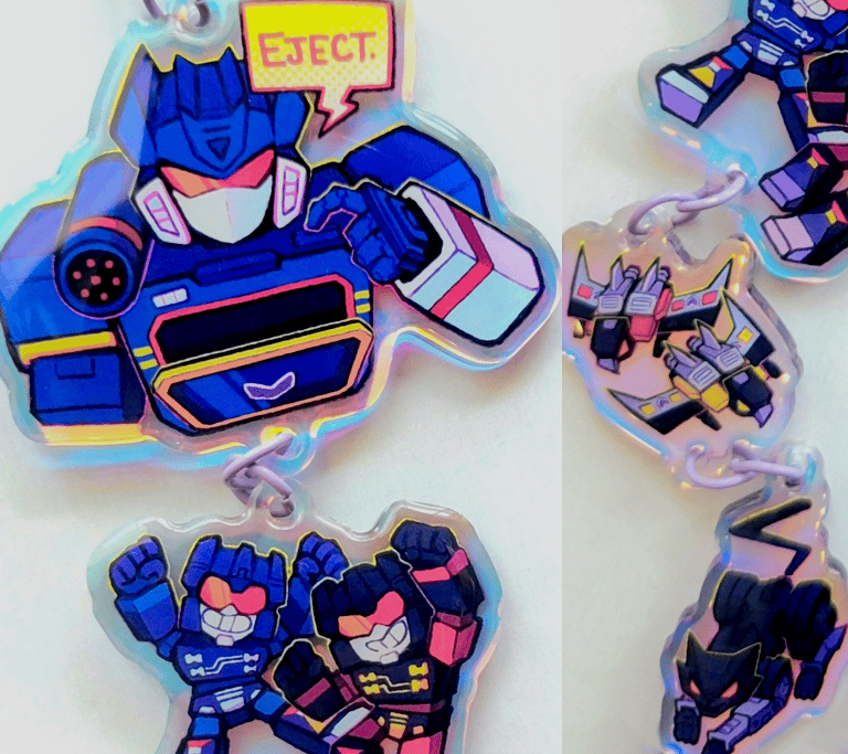 Four piece linking charm of Soundwave and his cassettes with a purple U-clasp.